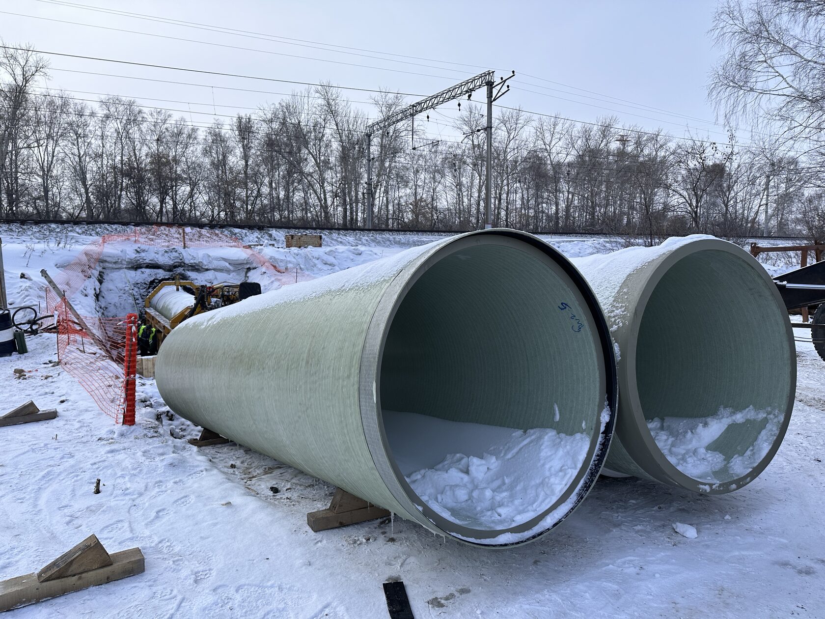 На объект поставлена труба стеклопластиковая OD1499 SN64000 торговой марки SUPERLIT. Монтаж водопропускной трубы выполнен бестраншейным способом и без остановки движения поездов.